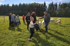 Svečiavomės Sūdavos kaimo bendruomenės namuose, kur mus šiltai priėmė bendruomenės pirmininkė Rita Brazaitienė. Parodė mus vaikų dienos centro ir kitas patalpas, papasakojo, kokius projektus įvykdė, pasidalino džiaugsmais ir vargais, kurie per dvidešimt bendruomenės gyvavimo metų juos aplankė. Jaukiai pasisėdėję toliau keliavome į netoliese esantį alpakų ūkį. Ūkio šeimininkai mus maloniai priėmė, pavedžiojo po alpakų aptvarus, papasakojo apie šiuos gyvūnus įdomių faktų. Prie alpakų galėjome prieiti labai arti ir pamaitinti jas morkomis.